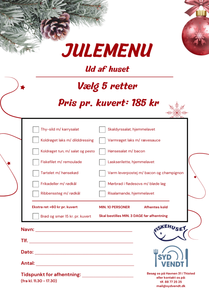 Julen nærmer sig og det samme gør både julens hygge og travlhed. Hos Sydvendt vil vi gerne gøre julen lidt nemmere og derfor har vi sammensat en lækker julemenu med et udvalg af klassiske juleretter og frisk fisk fra Fiskehuset. Udfyld blot nedenstående seddel og aflever den eller kom ned til os på vores adresse Havnen 31 i Thisted.